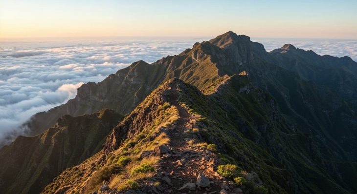 La star de l’île. Ce sentier relie les deux plus hauts sommets de Madère (1 818 m et 1 862 m) à travers des crêtes vertigineuses, des tunnels creusés dans la roche et des panoramas au-dessus des nuages.